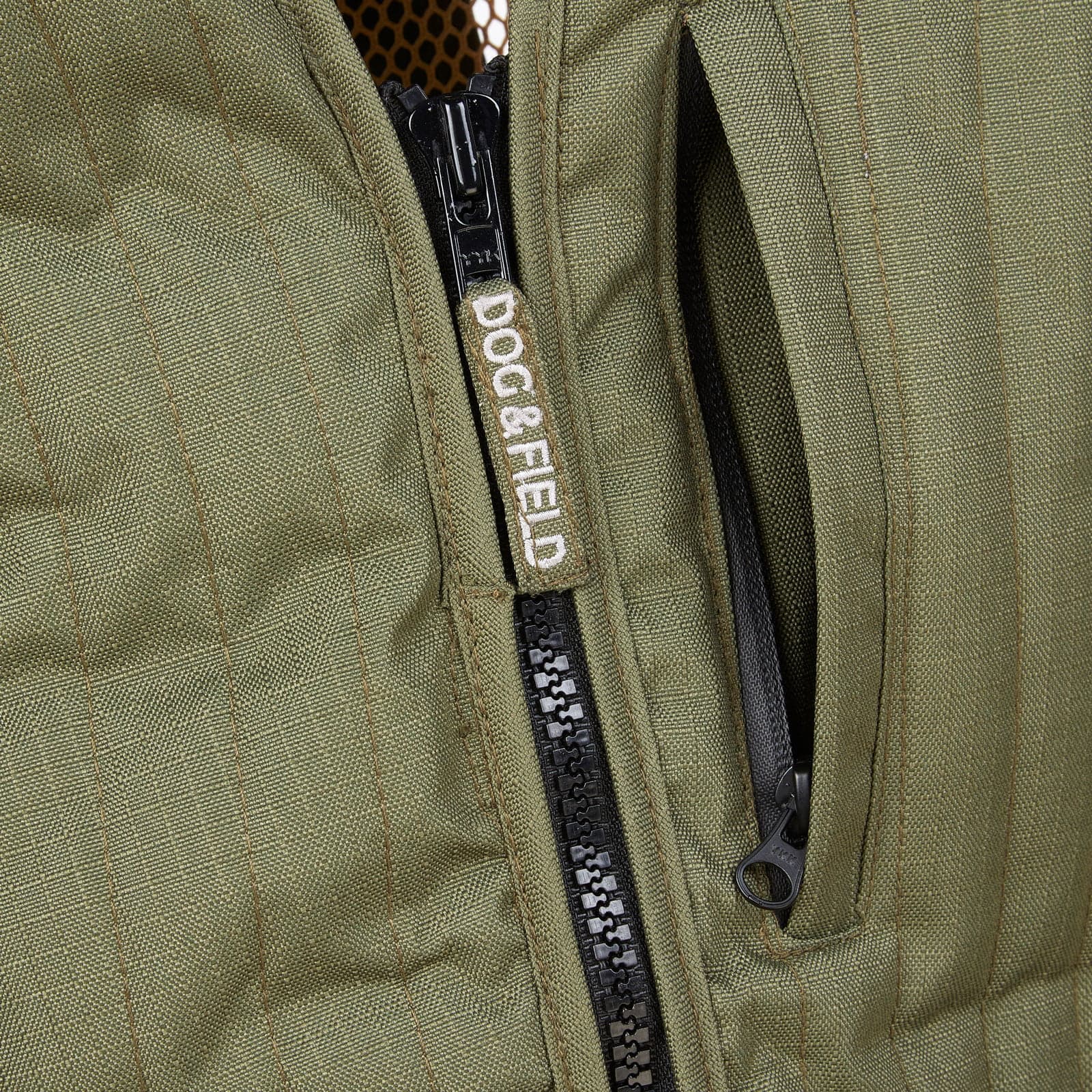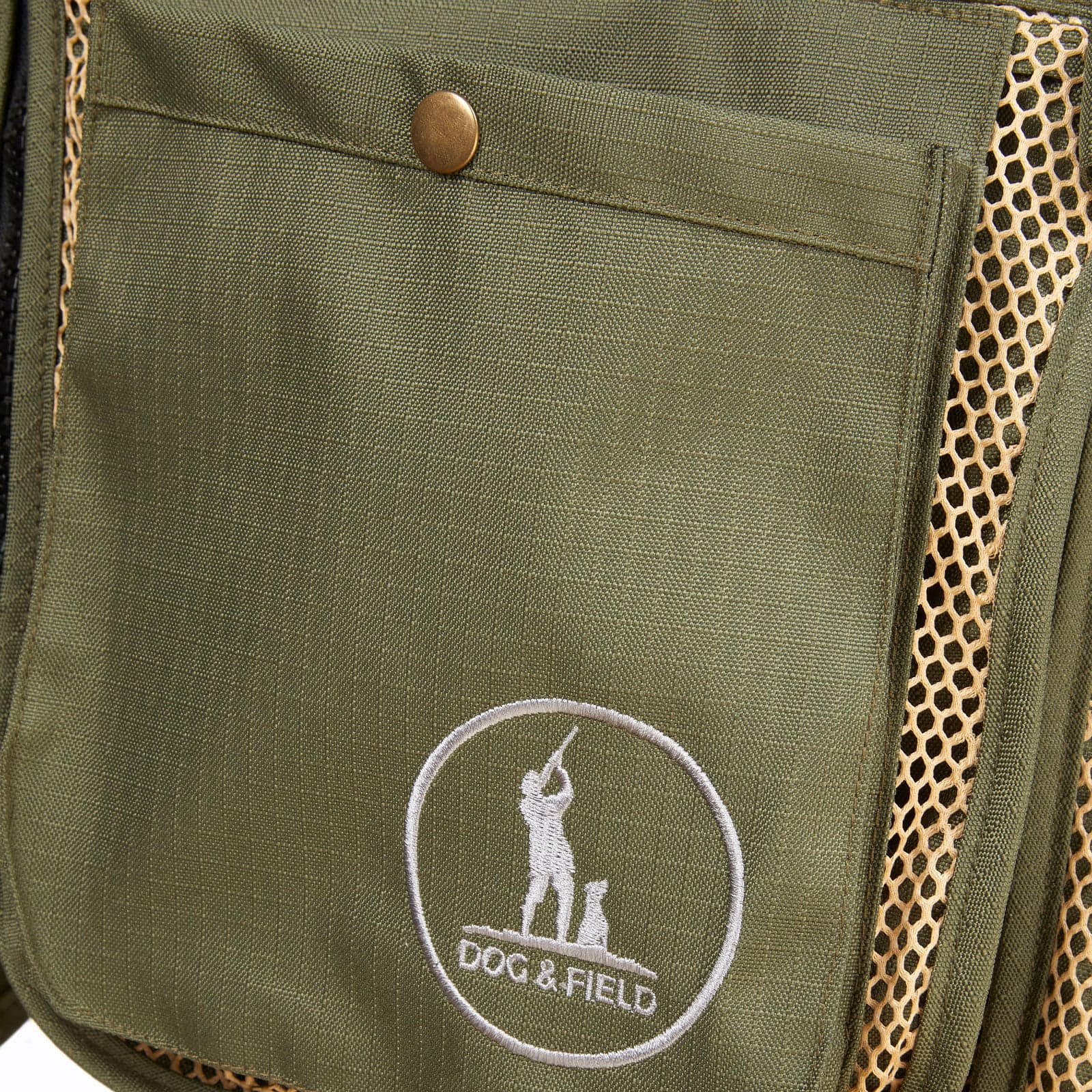 Ryggfickan är mycket rymlig. Att bakstycket på västen är lite längre än framstycket i kombination med den låga skärningen, gör att det är enkelt att nå även de apporter som finns längst ner i botten. Ryggfickan är invändigt klädd med ett vattentätt membran och har tre dräneringshål med öljetter för de riktigt blöta dagarna. De två fickorna på framsidan är bälgade och på insidan av västen finns det två mindre innerfickor med dragkedja. På vänster bröstpanel finns en vattentät ficka med dragkedja, perfekt för mobiltelefon och bilnycklar.