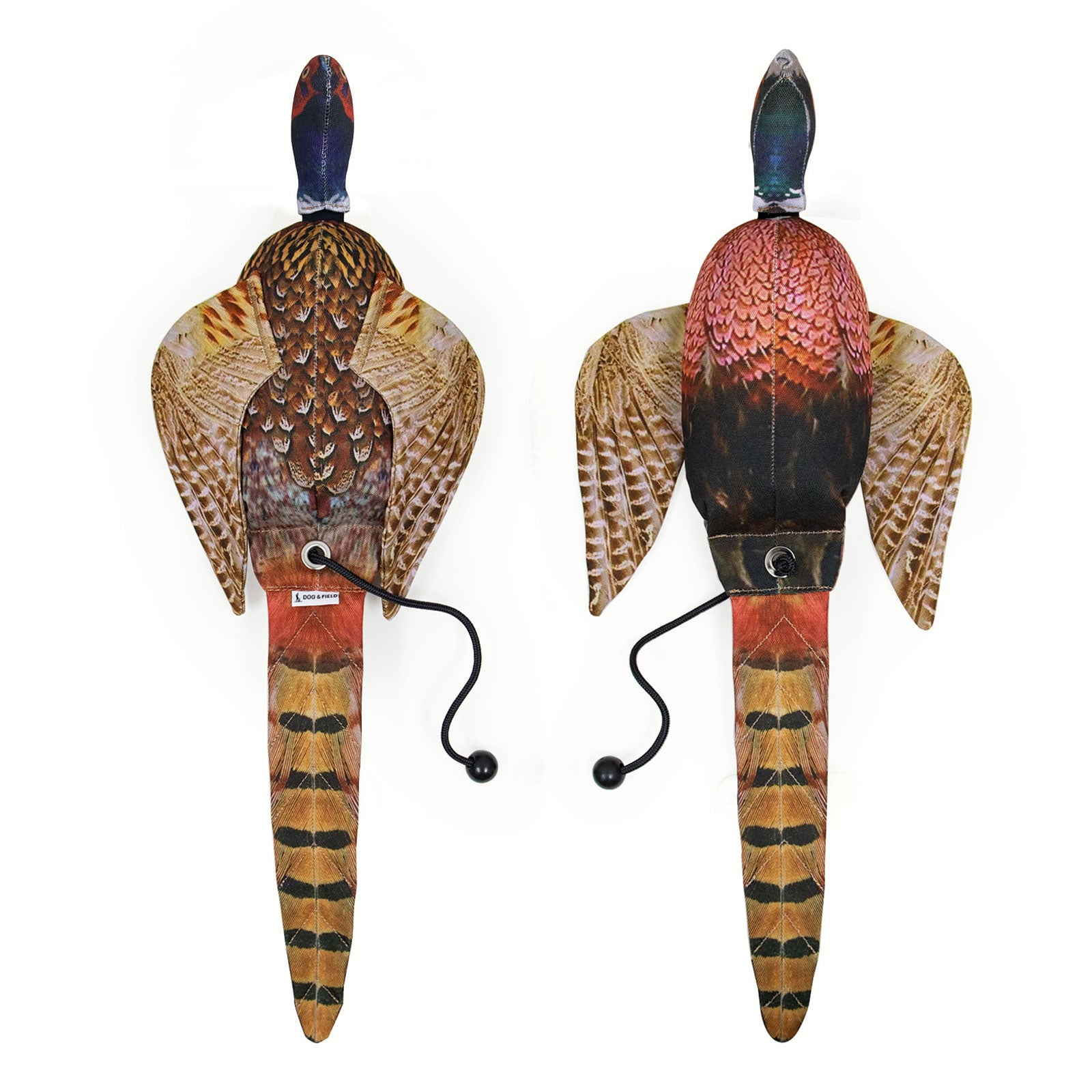 Den stora fasantuppen, som med sin långa stjärt och stora vingar kan vara en utmaning för hundar att bära. Dummien levereras med long throw-snöre för att underlätta kast.