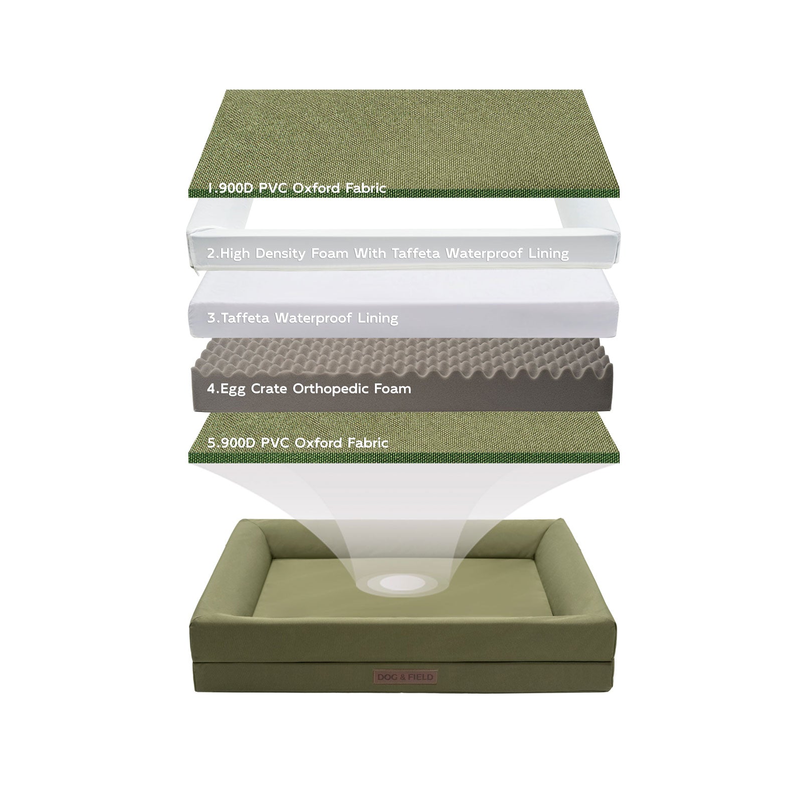 Tillverkad av 900D PVC-beklädd Oxford-väv i klassisk grönt, är denna hållbara och lättskötta hundsäng utrustad med en ortopedisk madrass i egg box-skum med överlägset ledstöd och komfort. Utformad utan glipor som samlar smuts eller hår, och tvättbar i maskin, är den lätt att rengöra. Bädden är hygienisk och perfekt för hundar i alla storlekar.
